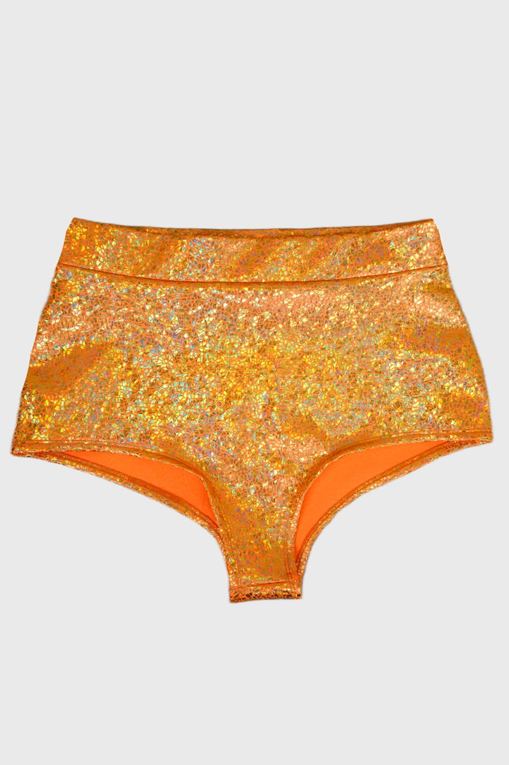 These high-waisted micro shorts burn bright in molten gold over a vivid orange base — a fierce fusion of heat and shine. The cheeky cut creates a daring silhouette, while the holographic finish throws off flashes of light like liquid fire with every move. Made in 4-way stretch and finished with soft elastic seams, they shape and flex effortlessly with your body. Designed for unapologetic statement moments — from festival stages to after-hours revelry, or why not a daring Halloween look?